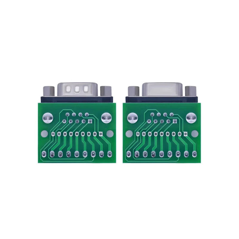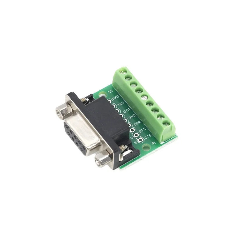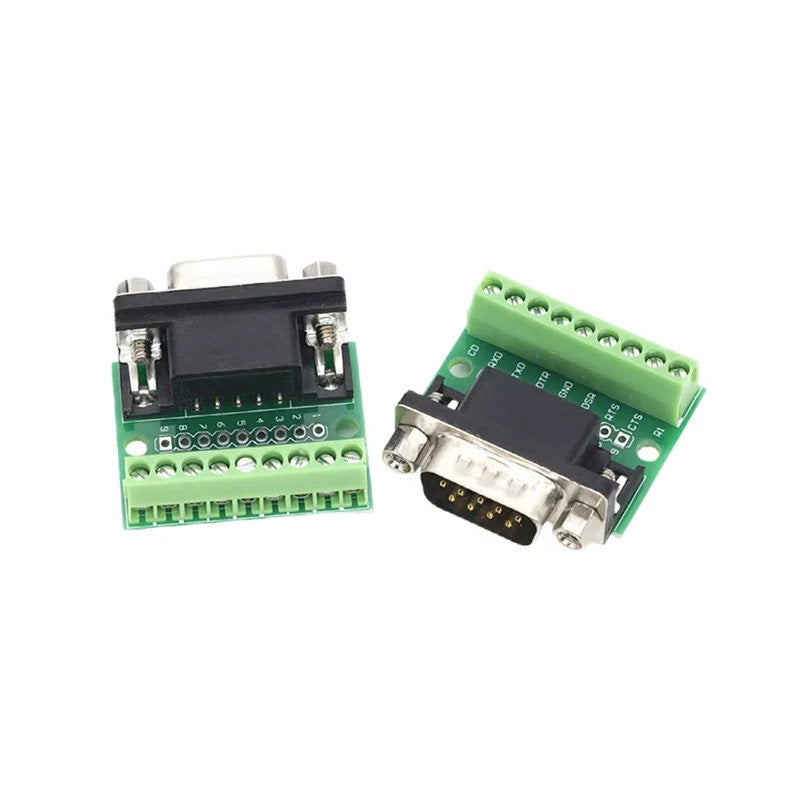 The DB9 D-SUB 9-pin male adapter breakout board is designed for simple, reliable connections in both prototyping and permanent installations. All nine pins of the DB9 connector are routed to clearly labeled screw terminal blocks, enabling quick and secure wiring without soldering.